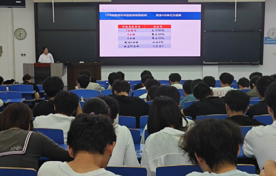 理论讲解结束后,进入实操体验环节。同学们热情高涨、积极踊跃,主动上台练习。在齐丽丽护士的耐心指导下,大家借助模拟人规范操作,及时纠正动作偏差,熟练掌握基础急救要领。