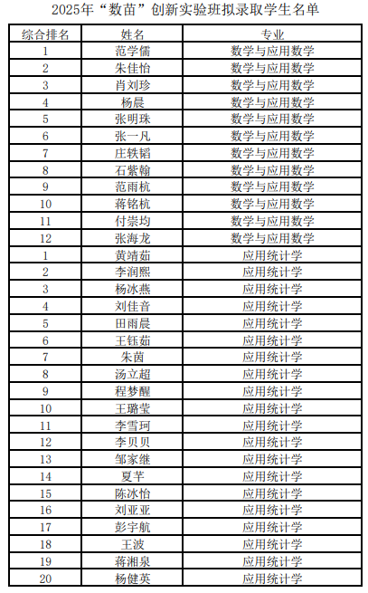 2025年“数苗”创新实验班拟录取结果公示如下: