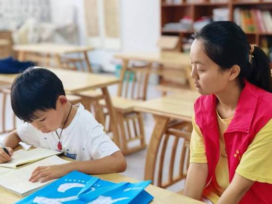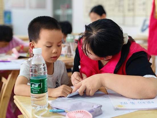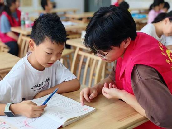 辅导作业的时光里,志愿者充满耐心,围着不同年龄的孩子转。小不点们捧着语文书,认字还磕磕绊绊,志愿者就凑过去,指着拼音一个字一个字带读;高年级的孩子埋头写题时,志愿者会轻轻走过去,翻开他们的练习册检查。整个托管室里,没有严肃的批评,只有笔尖划过纸的沙沙声,夹杂着“老师你看我读对了吗”的小声询问,和志愿者“真棒”的温柔回应。这份陪着慢慢长大的耐心,大概就是夏天里最暖的光。