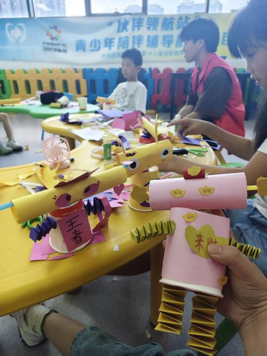 心理课上,“情绪猜猜盒”牵起共鸣,孩子们分享喜怒哀乐时,志愿者的轻拍与鼓励,让心灵贴得更近;趣味英语课里,儿歌节奏混着笑声,“单词钓鱼”的磁铁卡片晃出惊喜,卡通贴纸映着亮晶晶的眼;手工课上,纸杯、彩纸在桌面铺成彩浪,孩子们把童真期许,全粘进纸杯怪兽的笑脸里,最后满桌的彩纸精灵、纸杯玩偶被举得老高,每个歪扭褶皱里,都藏着夏天的雀跃 。