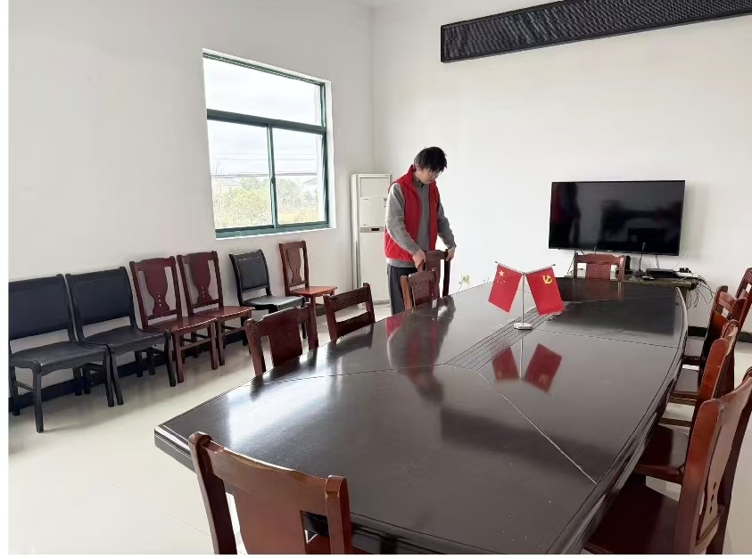在会议室整理工作中,刘震东展现了极高的标准。他不放过任何一个卫生死角,从擦拭桌椅积垢、清理灯具灰尘,到清理墙面过时标语,每一个细节都倾注了心血。经过努力,原本陈旧杂乱的会议室变得窗明几净,恢复了整洁。
