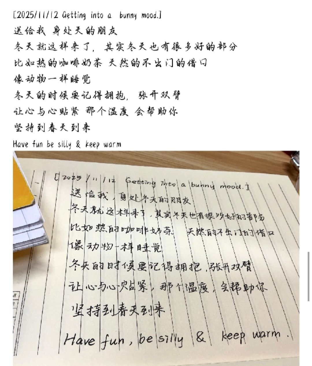 十一月的风带着凉意,却也藏着不期而遇的温暖。愿你裹紧外套时,能感受到掌心的温度;刷题疲惫时,能遇到一杯热饮的慰藉。陌生的朋友,愿你在这个秋冬,被阳光拥抱,被好运眷顾,所有难题都迎刃而解,所有温柔都如期而至。