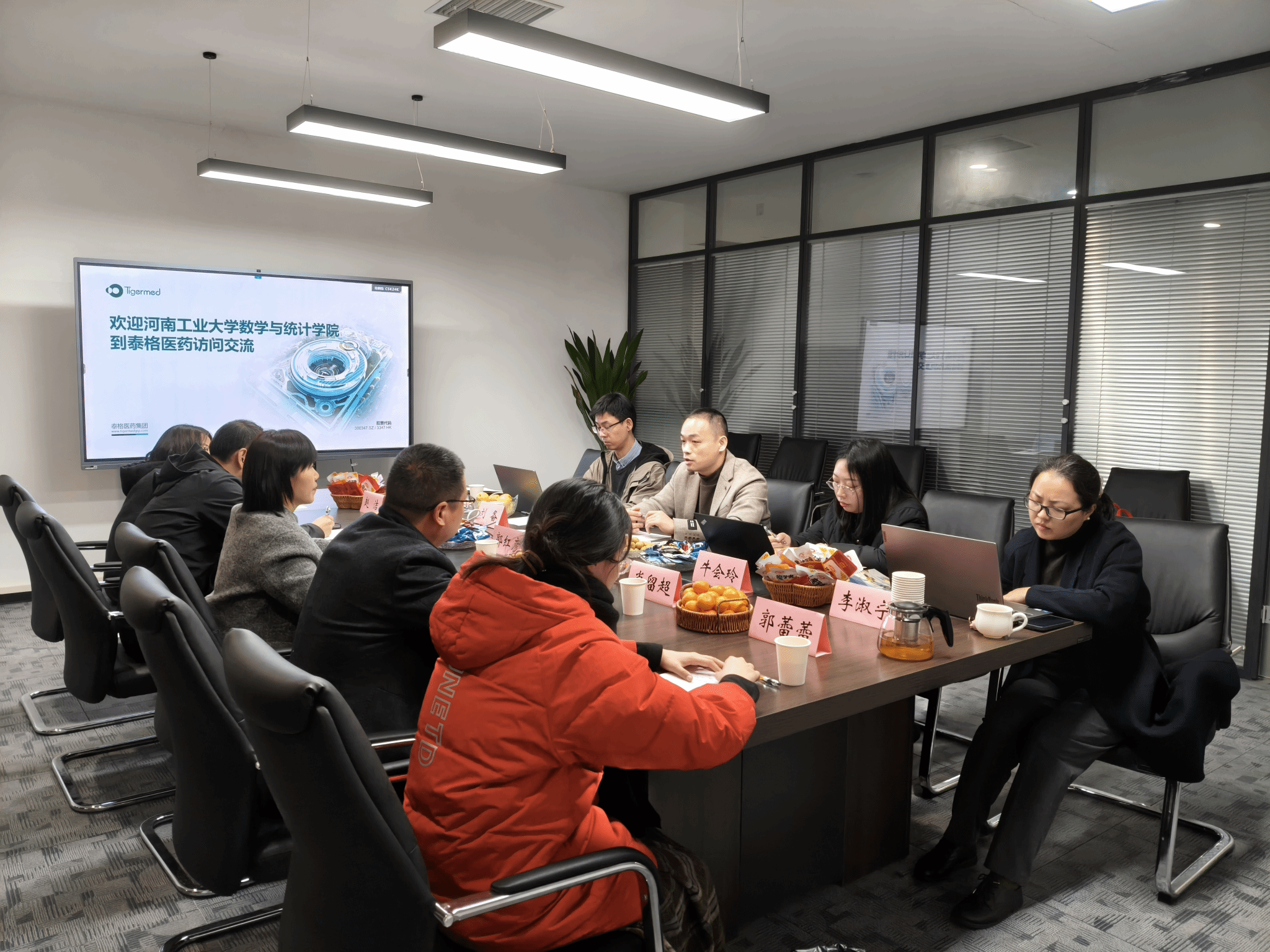 漯河泰格医药科技有限公司数统事业部副总经理夏欣,统计部经理牛会玲、刘备、李淑宁热情接到了星空体育 一行,并进行座谈交流。漯河泰格医药科技有限公司统计分析员、星空体育 校友郭蕾蕾一同参加。