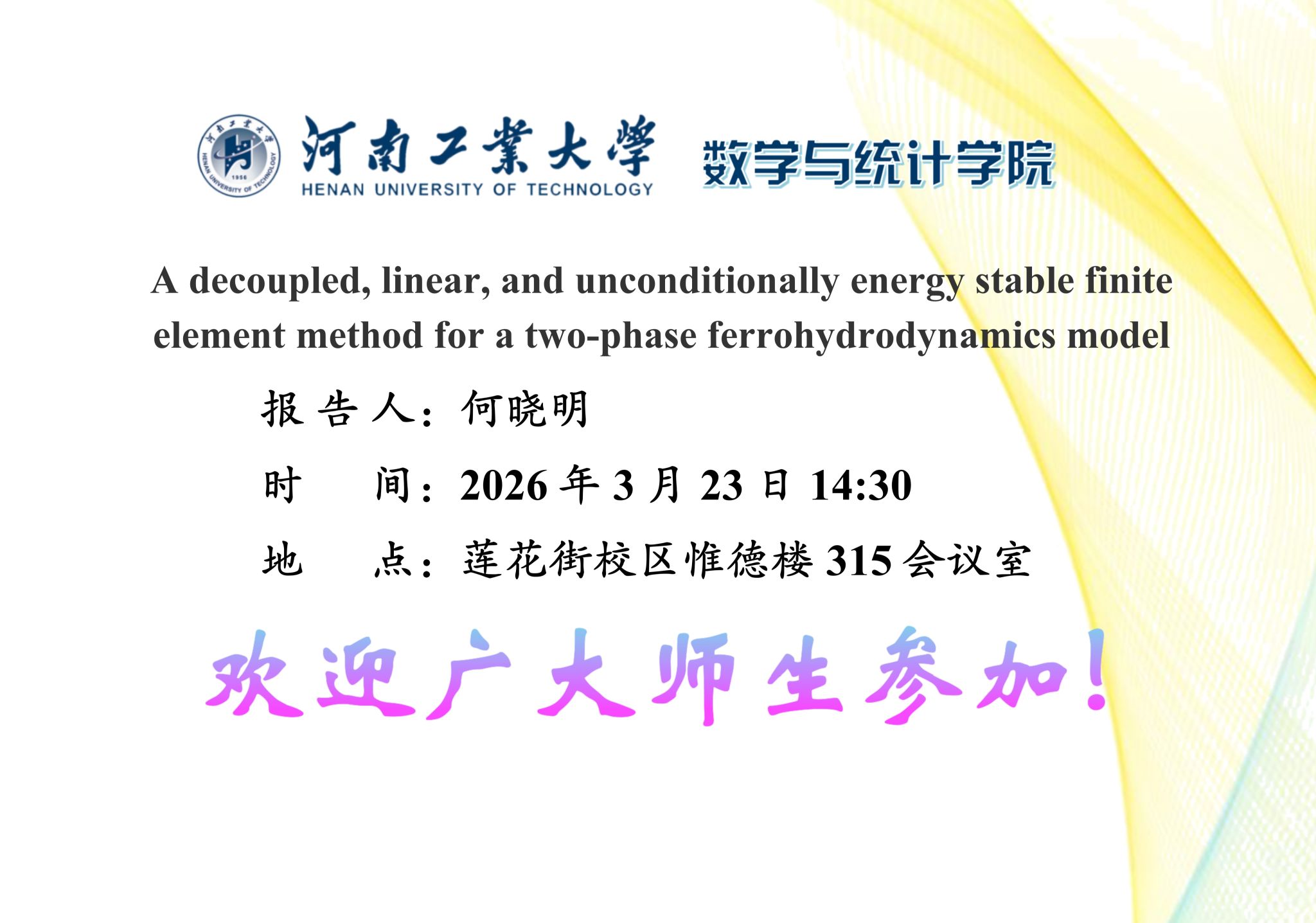 报 告 人:何晓明 美国密苏里科技大学报告题目:A decoupled, linear, and unconditionally energy stable finite element method for a two-phase ferrohydrodynamics model报告时间:2026年3月23日下午14:30-16...