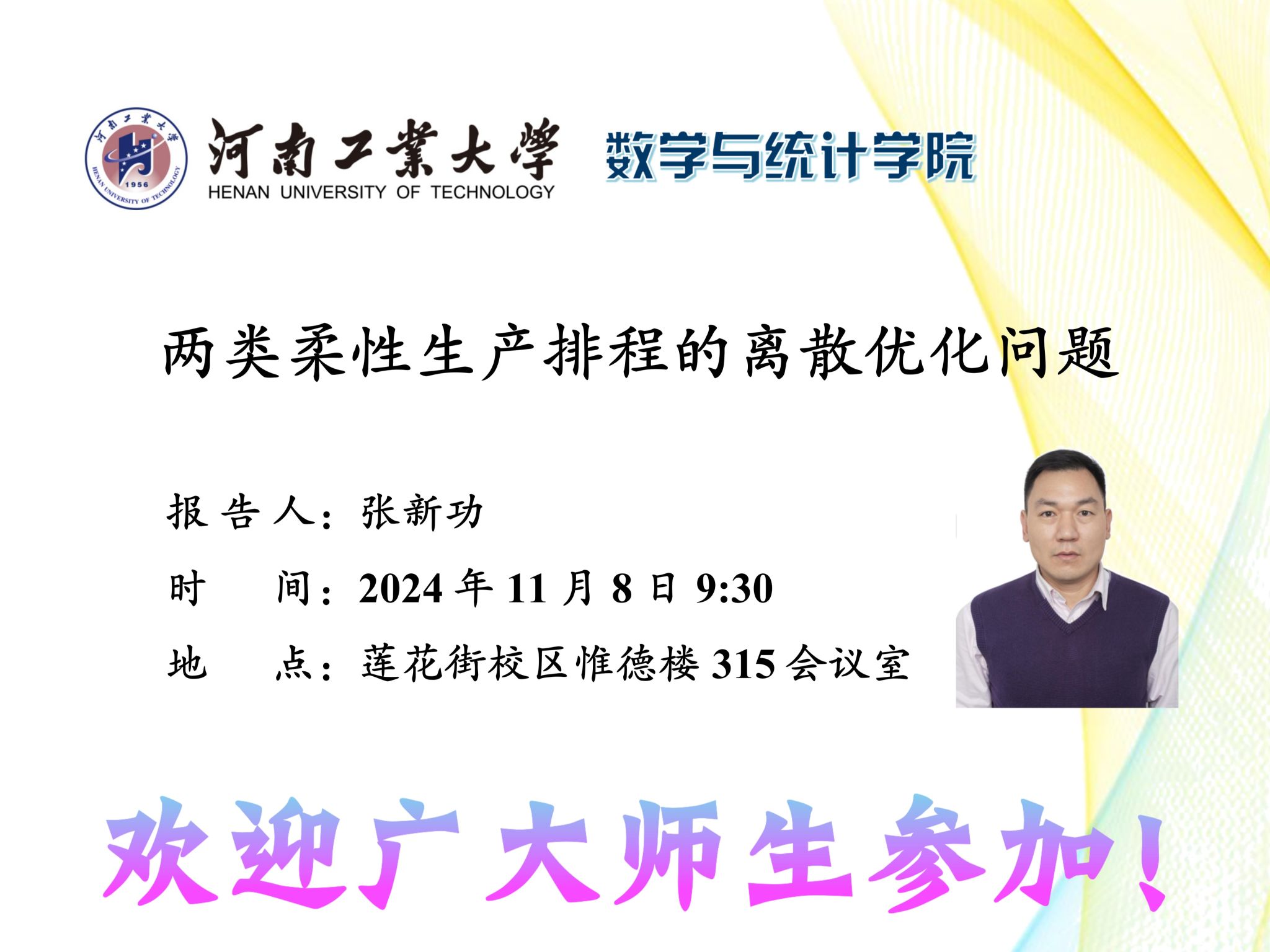 报告题目:两类柔性生产排程的离散优化问题报 告 人:张新功报告时间:2024年11月8日9:30报告地点: 莲花街校区惟德楼315会议室报告人简介:张新功,重庆师范大学数学科学星空体育 ,教授,博士后,博士生导师,重庆...