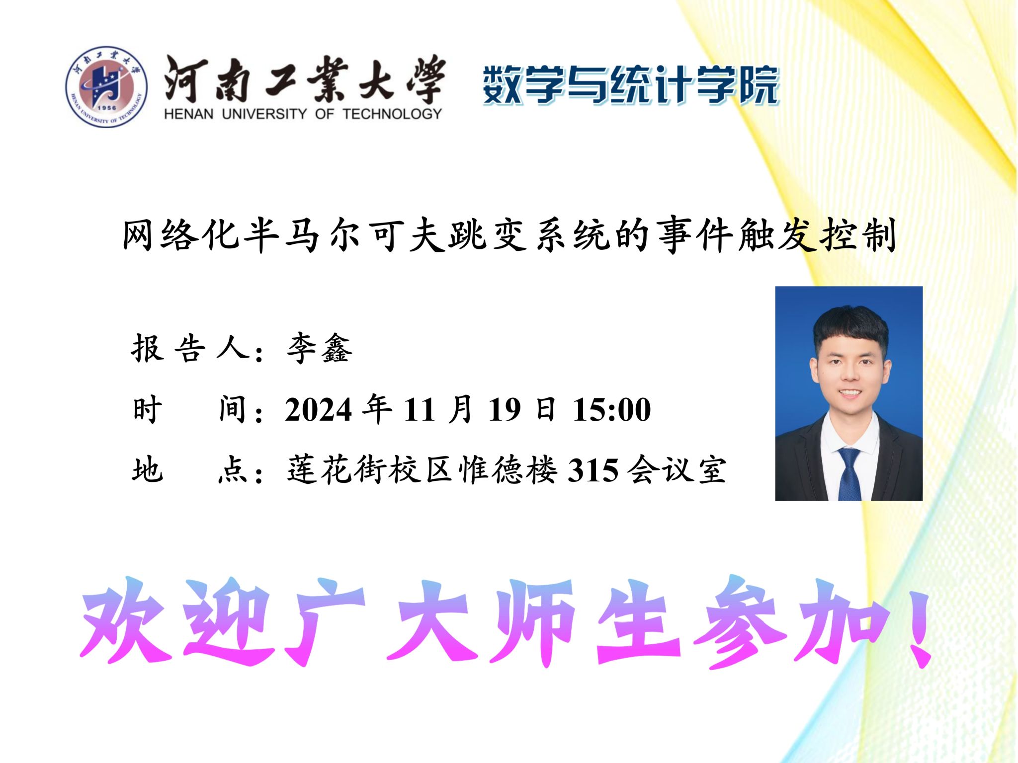 报告题目:网络化半马尔可夫跳变系统的事件触发控制报 告 人:李鑫报告时间:11月19日下午15:00报告地点: 莲花街校区惟德楼315会议室报告人简介:李鑫,博士。毕业于郑州大学运筹学与控制论专业。主要研究方向为...