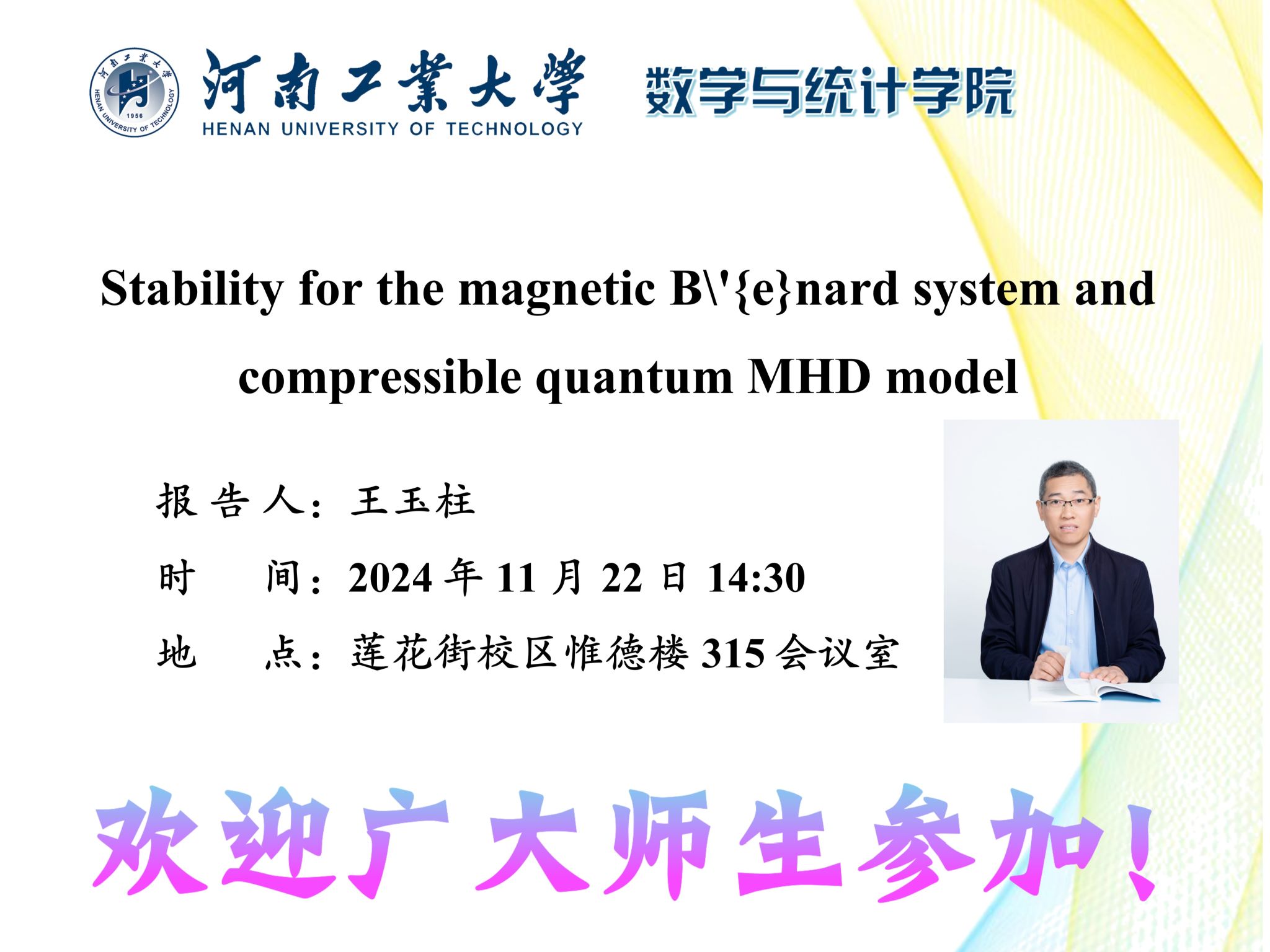 报告题目: Stability for the magnetic B\'{e}nard system and compressible quantum MHD model报 告 人:王玉柱报告时间:2024年11月22日14:30报告地点: 莲花街校区惟德楼315会议室报告人简介:王玉柱,教授、...