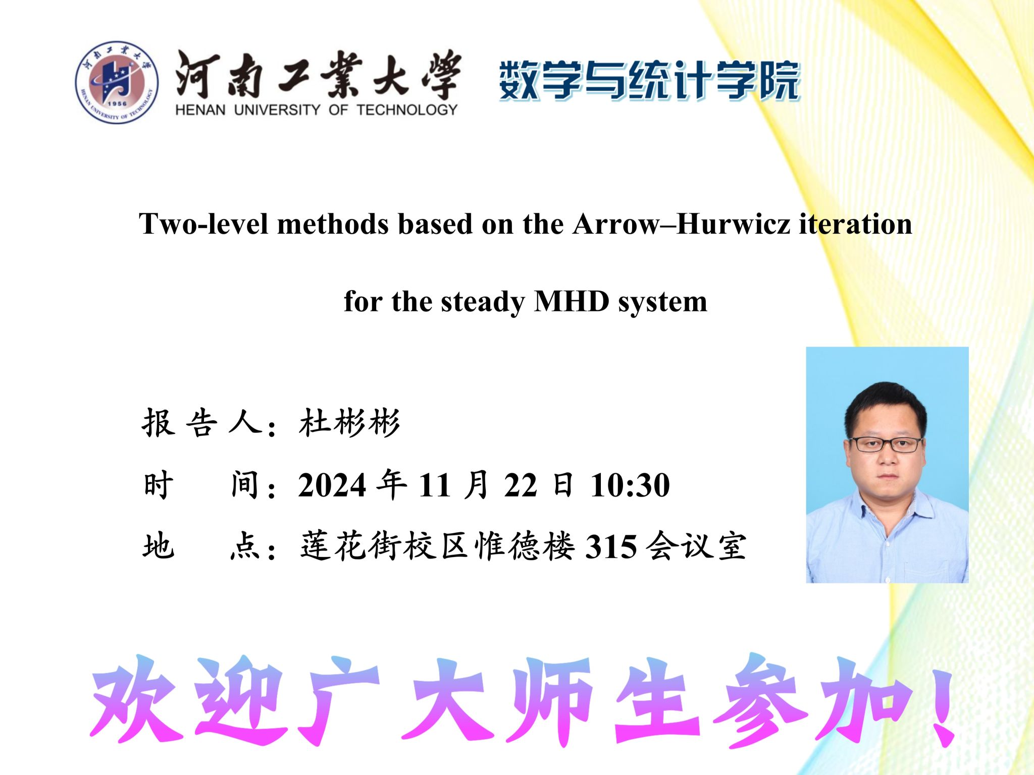 报告题目:Two-level methods based on the Arrow–Hurwicz iteration for the steady MHD system报 告 人:杜彬彬报告时间:11月22号上午10:30报告地点: 莲花街校区惟德楼315会议室报告人简介:杜彬彬,理学博...