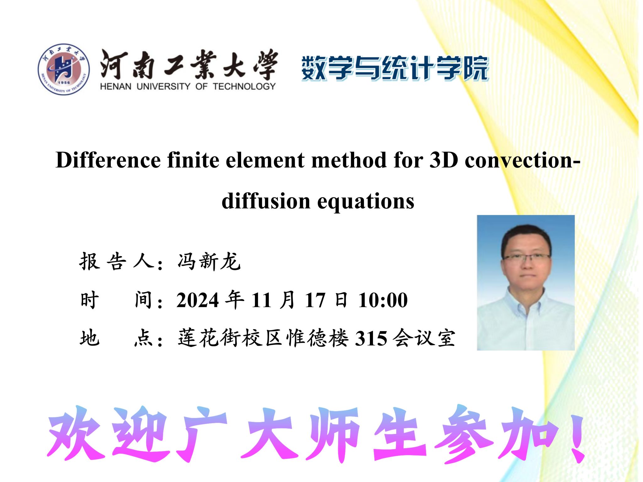 报告题目:Difference finite element method for 3D convection-diffusion equations 报 告 人:冯新龙报告时间:11月17日10:00报告地点: 莲花街校区惟德楼315会议室报告人简介:冯新龙,博士,教授,博士生...