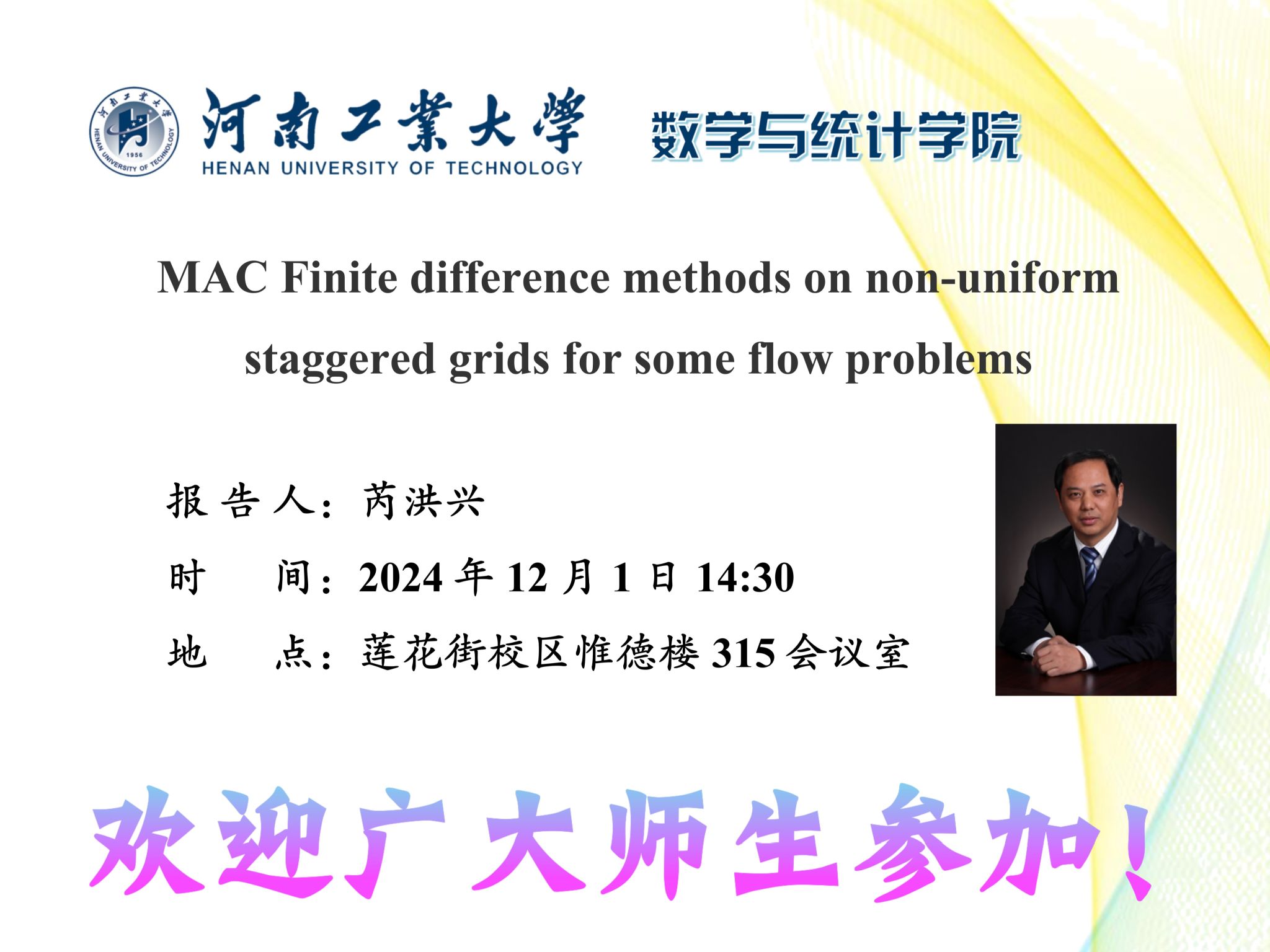 报告题目: MAC Finite difference methods on non-uniform staggered grids for some flow problems报 告 人:芮洪兴报告时间:2024年12月1日14:30--15:30报告地点: 莲花街校区惟德楼315会议室报告人简介:芮洪...