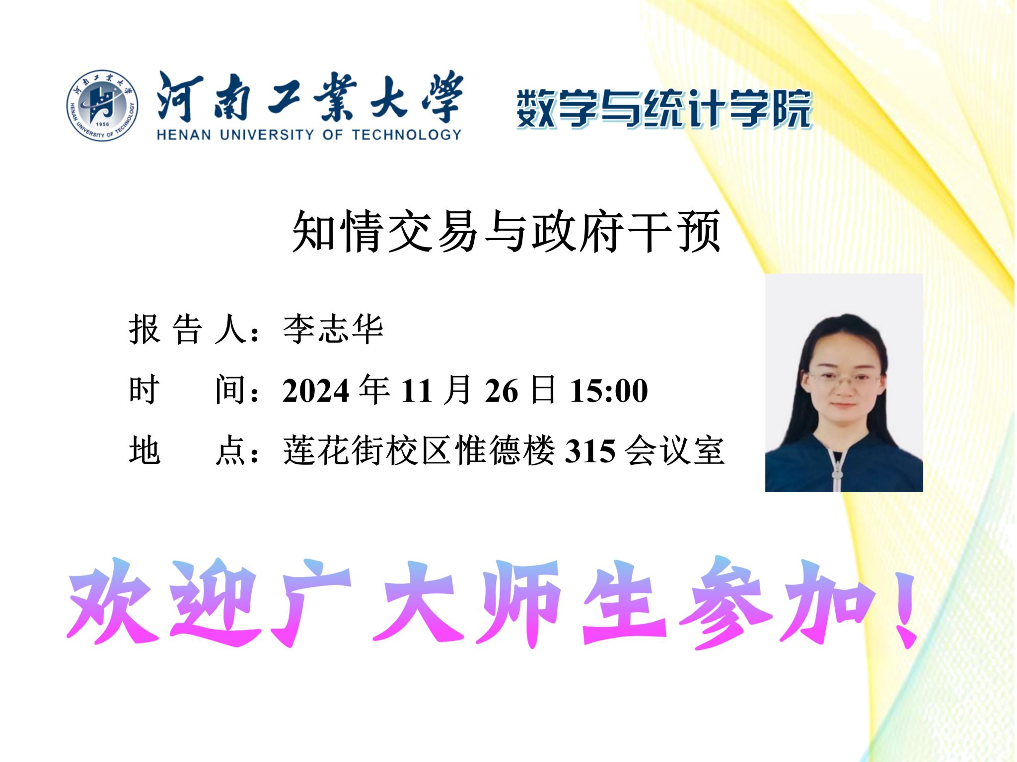 报告题目:知情交易与政府干预报 告 人:李志华报告时间:11月26日下午15:00报告地点:莲花街校区惟德楼315会议室报告人简介:李志华,博士,毕业于东北师范大学统计学。主要研究方向为非对称信息、资产定价、...