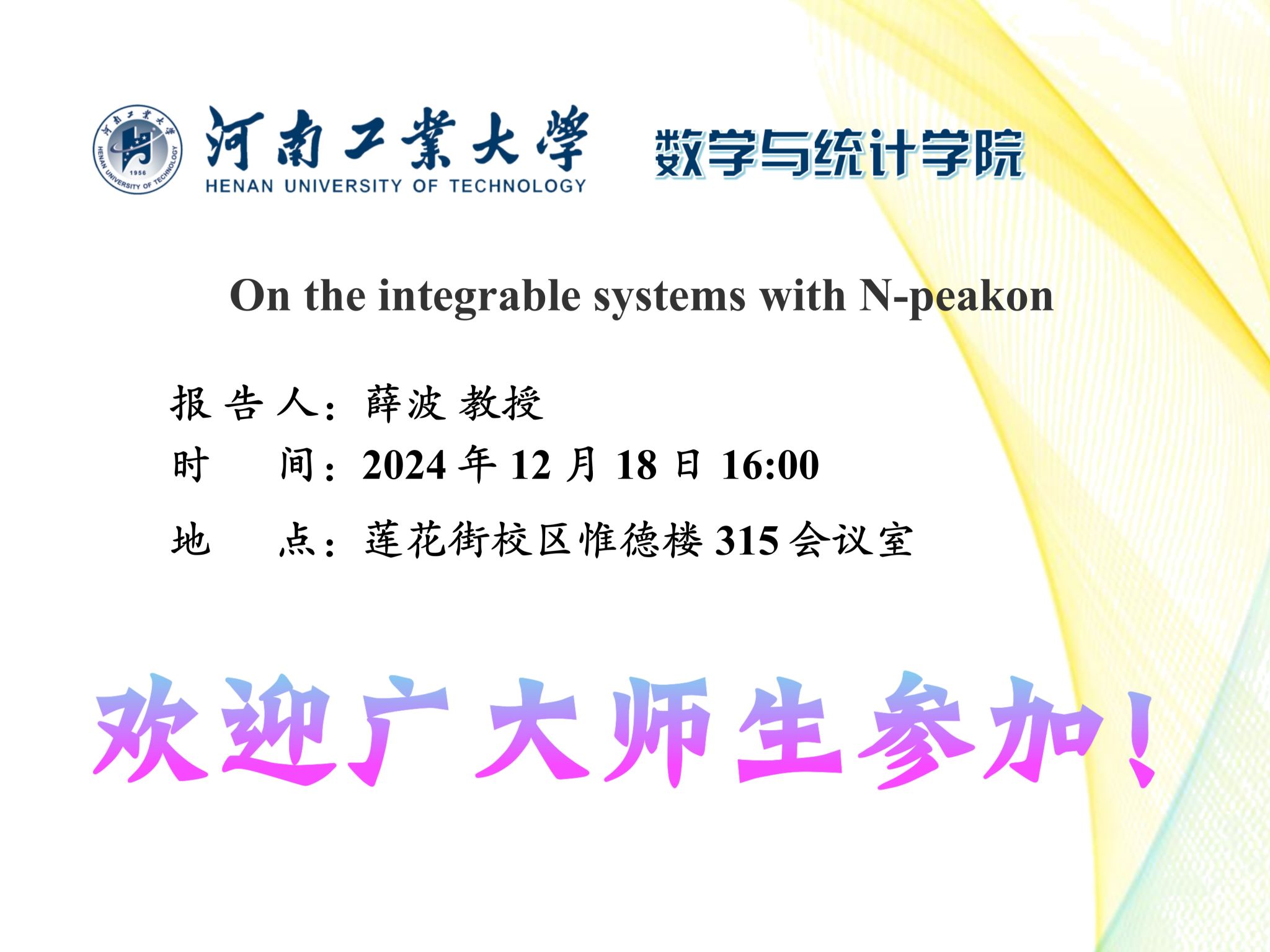 报告题目:On the integrable systems with N-peakon报 告 人:薛波报告时间:2024年12月19日16:00-17:00报告地点:莲花街校区惟德楼315会议室报告人简介:薛波,二级教授,博士生导师,现任河南大学副校长。...