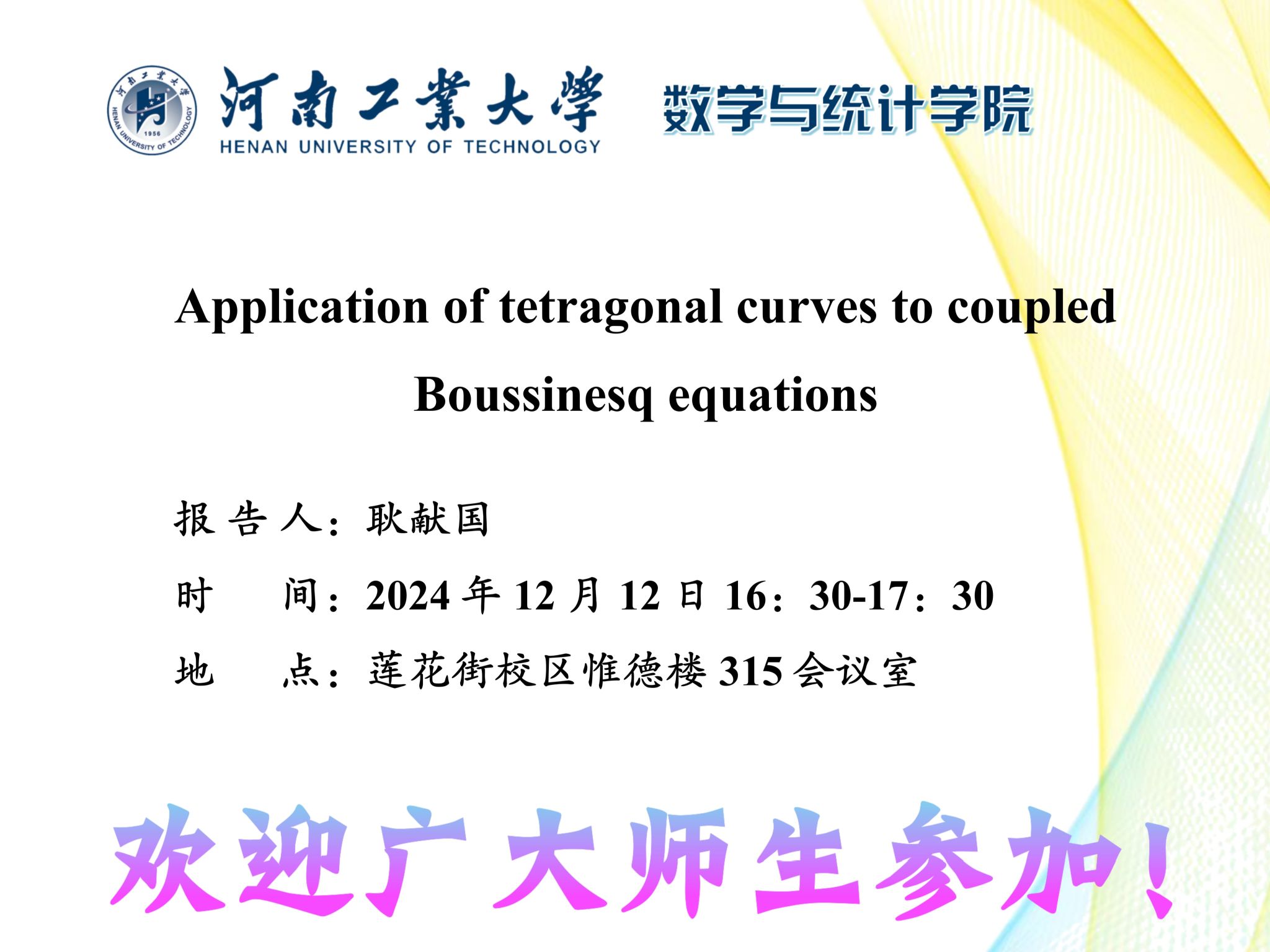 报告题目:Application of tetragonal curves to coupled Boussinesq equations报 告 人:耿献国报告时间:2024年12月12日下午16:30-17:30报告地点:莲花街校区惟德楼315会议室报告人简介:耿献国,郑州大学...