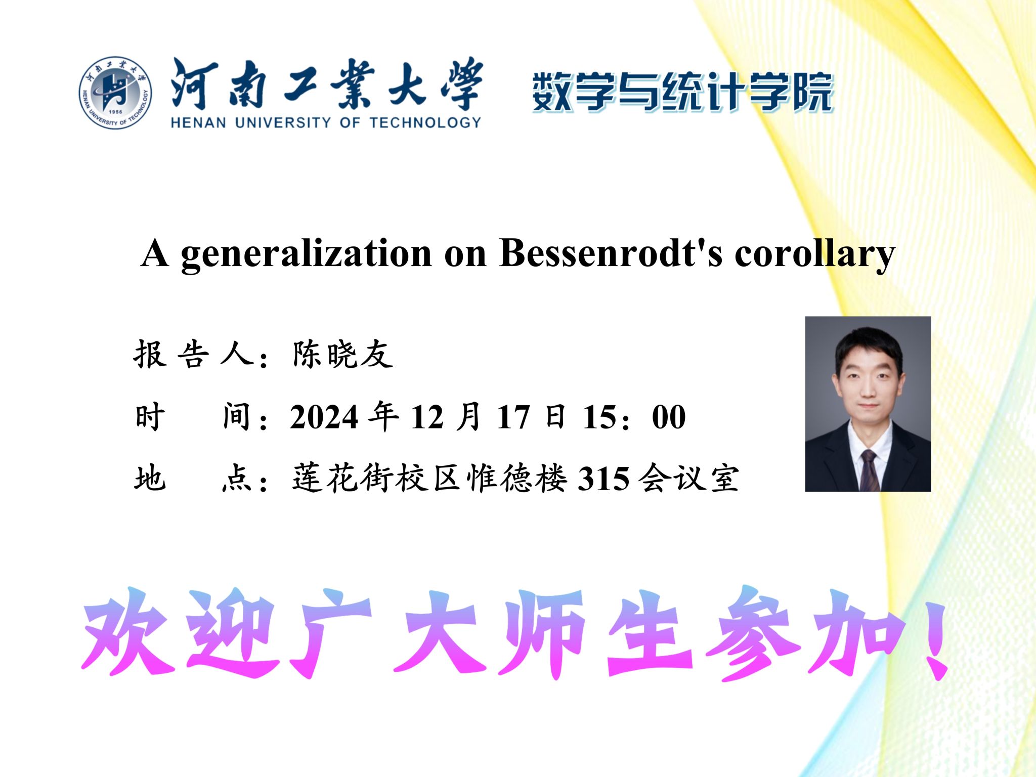 报告题目:A generalization on Bessenrodt's corollary报 告 人:陈晓友报告时间:2024年12月17日 下午3:00报告地点: 莲花街校区惟德楼315报告人简介: 陈晓友,博士,副教授,星空体育 教...
