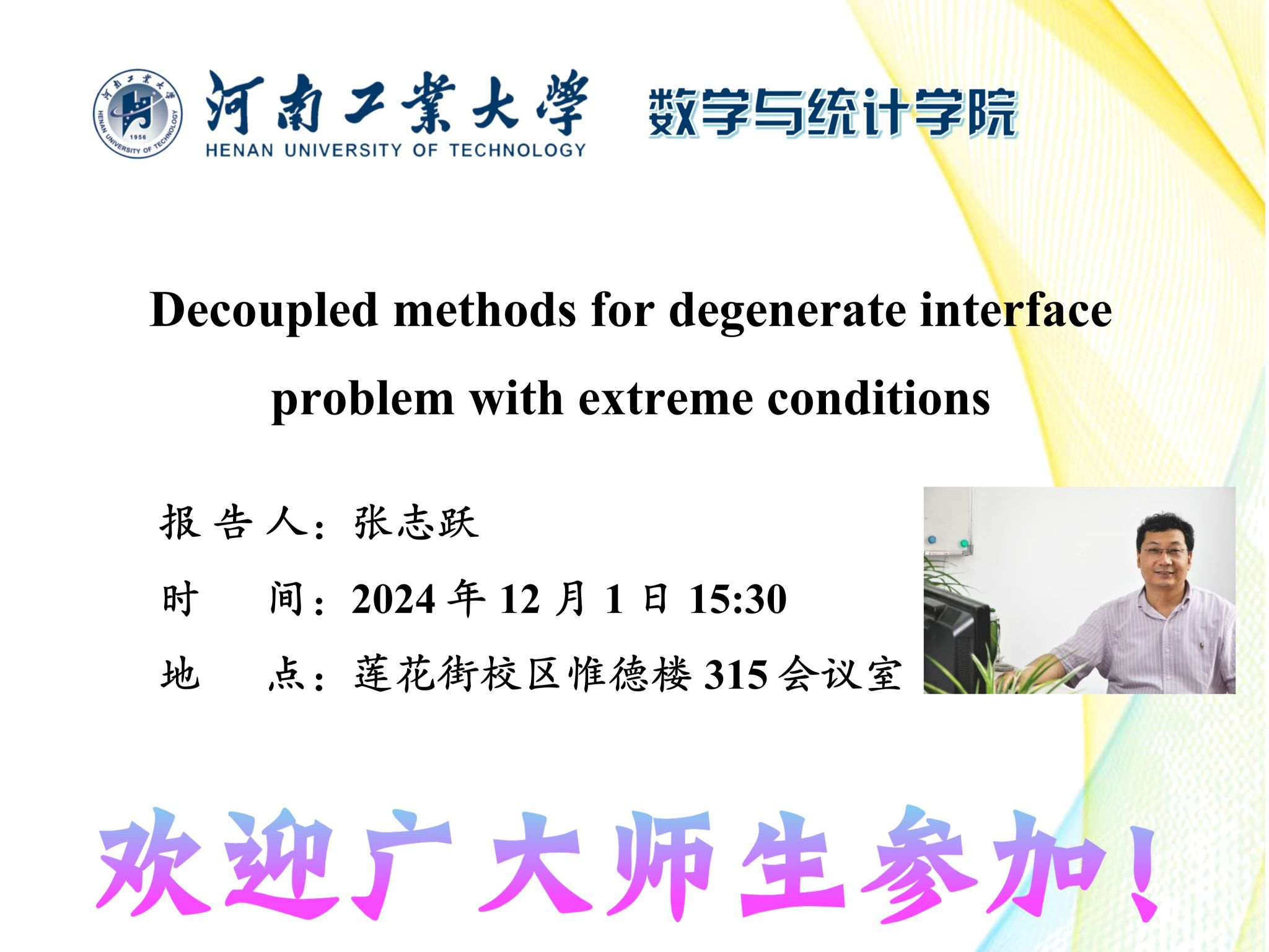 报告题目:Decoupled methods for degenerate interface problem with extreme conditions报 告 人:张志跃报告时间:2024年12月2日15:30-16:30报告地点:莲花街校区惟德楼315会议室报告人简介:张志跃,南京师...