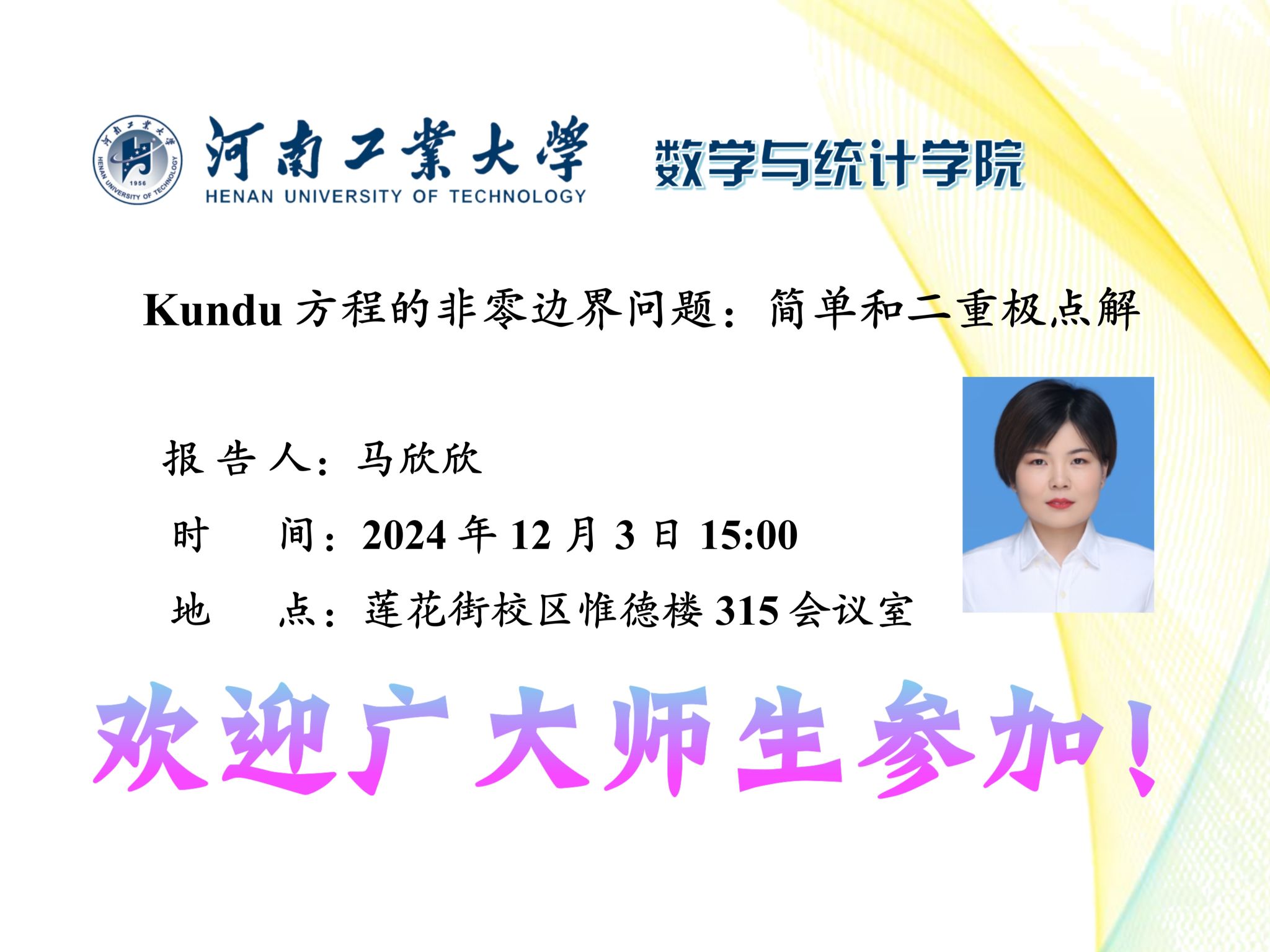 2024年12月3日,星空体育 “数学物理方程与动力系统”团队成员马欣欣博士作了题为“Kundu方程的非零边界问题:简单和二重极点解”学术报告,星空体育 院长谷存昌、副院长曹建莉、科研创新培育团队负责人、骨干教...