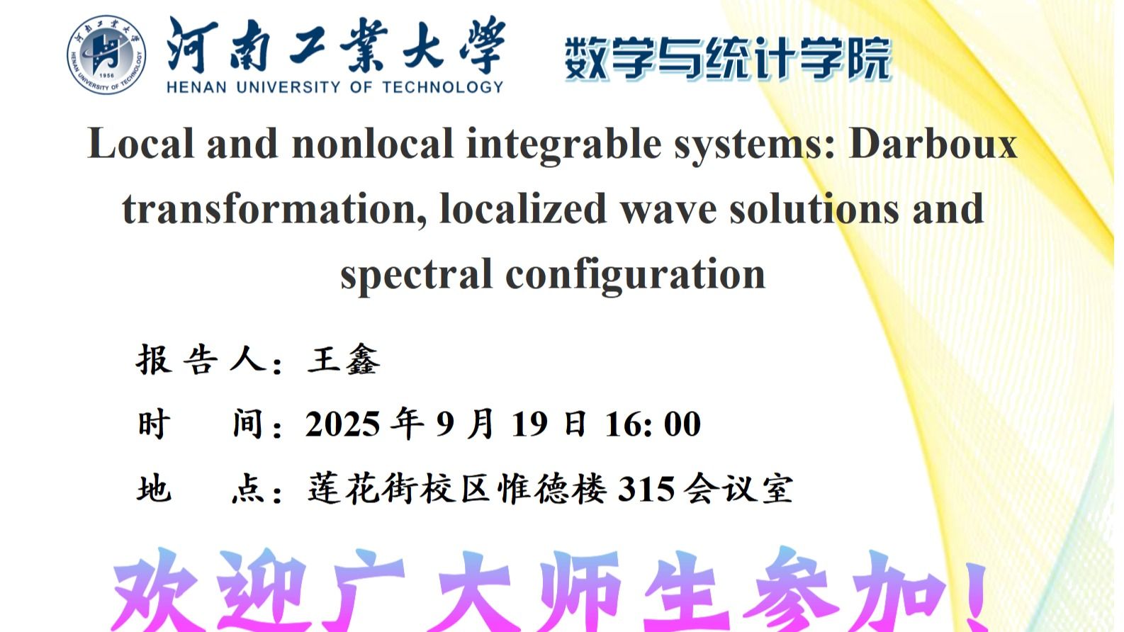 报告题目:Local and nonlocal integrable systems: Darboux transformation, localized wave solutions and spectral configuration报 告 人:王鑫报告时间:9月19日16:00报告地点: 莲花街校区惟德楼315会议室...