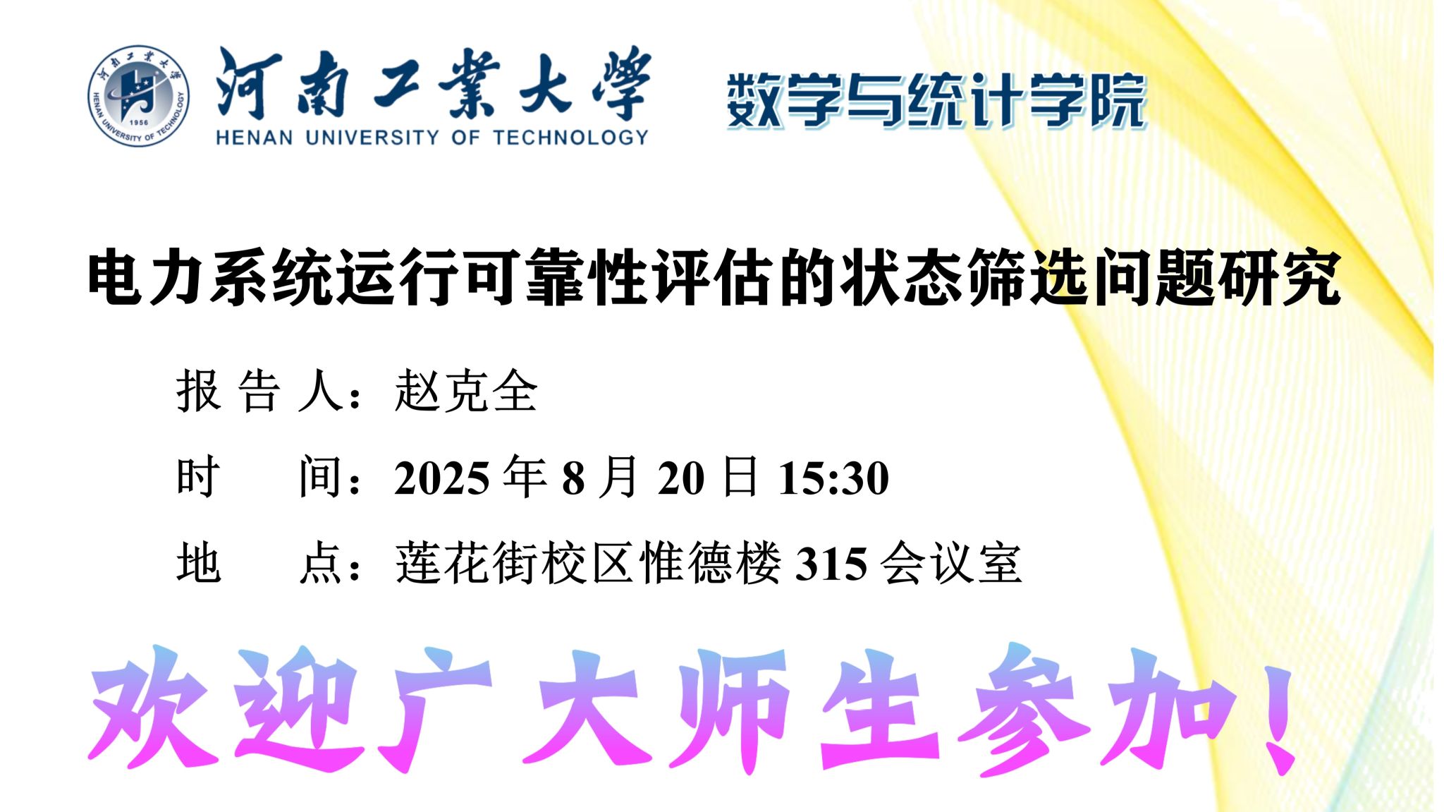报告题目:电力系统运行可靠性评估的状态筛选问题研究报 告 人:赵克全报告时间:2025年8月20日15:30报告地点: 莲花街校区惟德楼315会议室报告人简介:赵克全,博士,教授,博士生导师,国家重点研发计划项目...