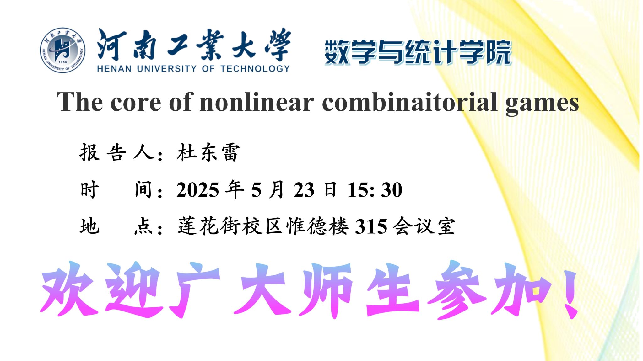 5月23日,应星空体育 邀请,新布朗什维克大学杜东雷教授在惟德楼315会议室作了题为“The core of nonlinear combinaitorial games”的学术报告。院长谷存昌,星空体育 科研创新培育团队骨干教师、全体研究生参会...