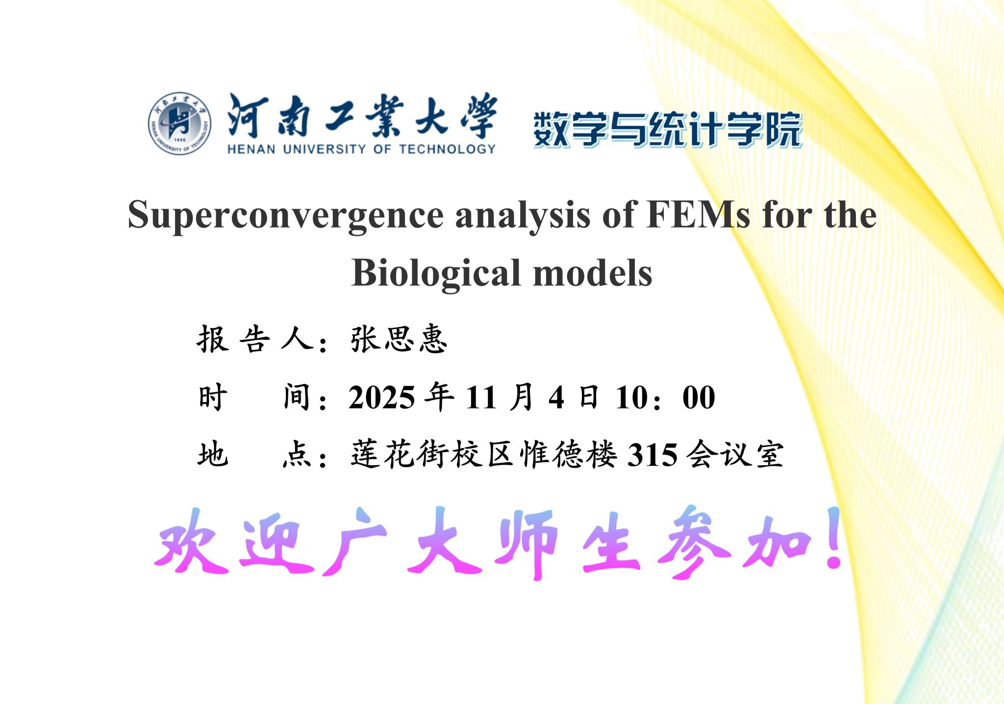 报告题目:Superconvergence analysis of FEMs for the Biological models报 告 人:张思惠报告时间:2025年11月4日10:00报告地点:莲花街校区惟德楼315会议室报告人简介: 张思惠,博士,郑州大学讲师,硕士生...